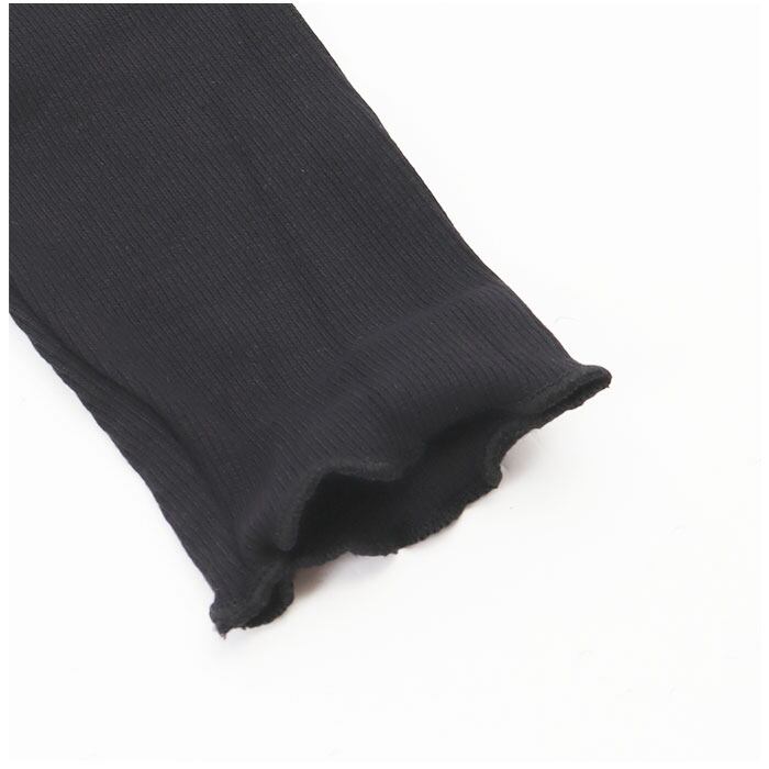 ・上身頃部分はすっきりとしたシルエットを作り出す、縦リブ仕様。襟元や袖口のメローデザインがポイント。
