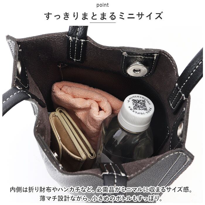 ・内側は折り財布やハンカチなど、必需品がミニマルに収まるサイズ感。薄マチ設計ながら、小さめのボトルもすっぽり。