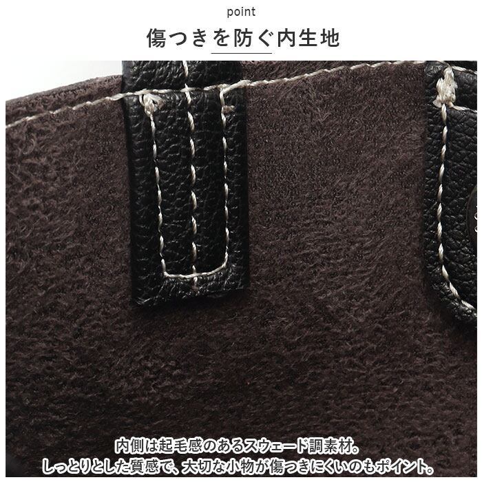 ・内側は起毛感のあるスウェード調素材。しっとりとした質感で、大切な小物が傷つきにくいのもポイント。