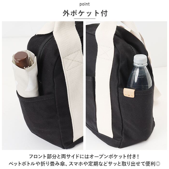 ・フロント部分と両サイドにはオープンポケット付き!ペットボトルや折り畳み傘、スマホや定期などサッと取り出せて便利◎