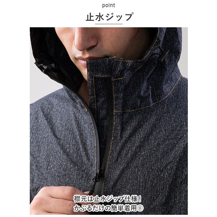 ・耐水圧:10,000mm、透湿度:5,000g/m2/24hの透湿防水素材で、雨や水を通さないのに体から発せられる蒸気を逃がすので、ムレにくく雨の日でも快適!