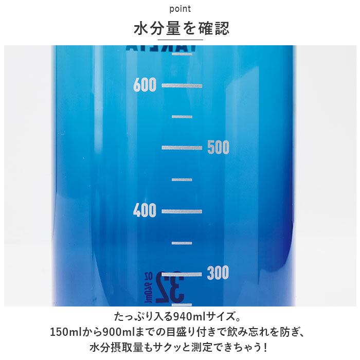 ・たっぷり入る940mlサイズ。150mlから900mlまでの目盛り付きで飲み忘れを防ぎ、水分摂取量もサクッと測定できちゃう!