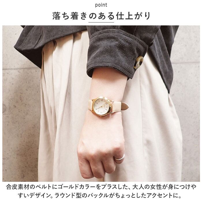 ・合皮素材のベルトにゴールドカラーをプラスした、大人の女性が身につけやすいデザイン。ラウンド型のバックルがちょっとしたアクセントに。
