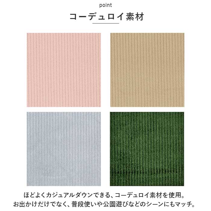 ・ほどよくカジュアルダウンできる、コーデュロイ素材を使用。お出かけだけでなく、普段使いや公園遊びなどのシーンにもマッチ。