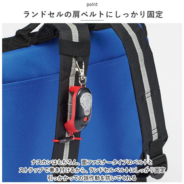 ・ナスカンはもちろん、面ファスナータイプのベルトとストラップで巻き付けるからランドセルベルトにしっかり固定。引っかかっての誤作動を防いでくれる。