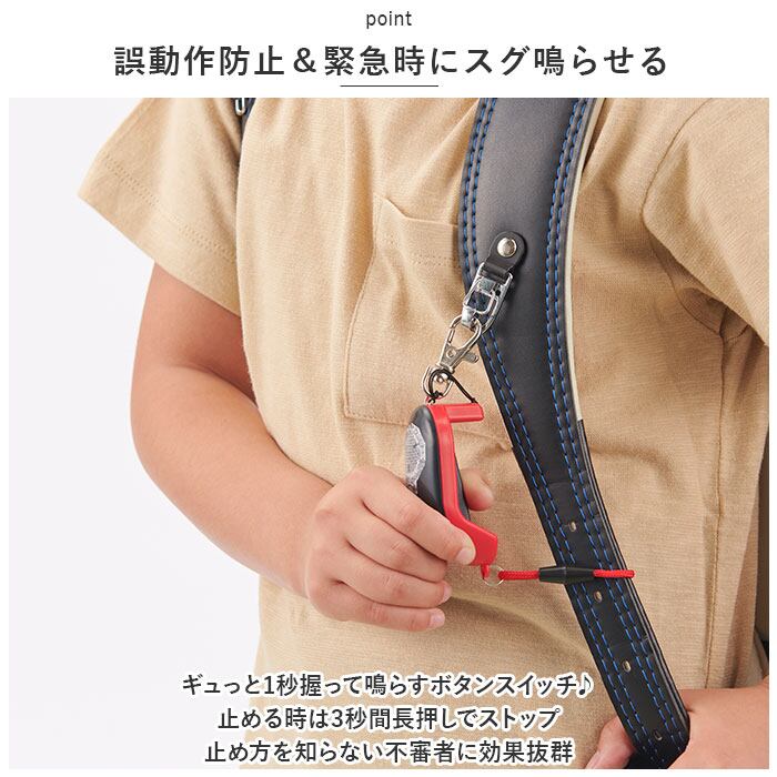 ・大きな音で異変を周りにお知らせ!不審者対策はもちろん、災害時密閉された空間に閉じ込められた時や、迷子になった時も音で位置をお知らせ。