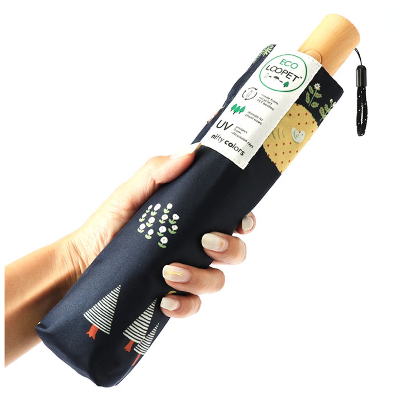 ・廃棄されるペットボトルをリサイクルした生地を使用。3本のペットボトルが1本の傘に生まれ変わる。サスティナブルで地球に優しいアイテム。