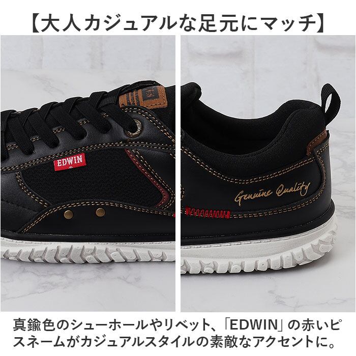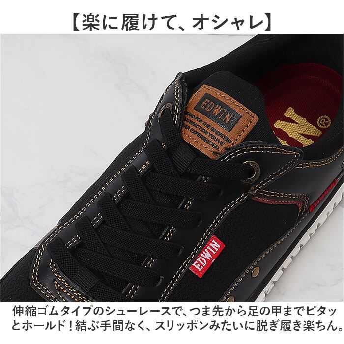 ・スムーズな質感のフェイクレザーにスポーティなメッシュ素材を合わせた異素材コンビデザイン。真鍮色のシューホールやリベット、「EDWIN」の赤いピスネームがカジュアルスタイルの素敵なアクセントに。