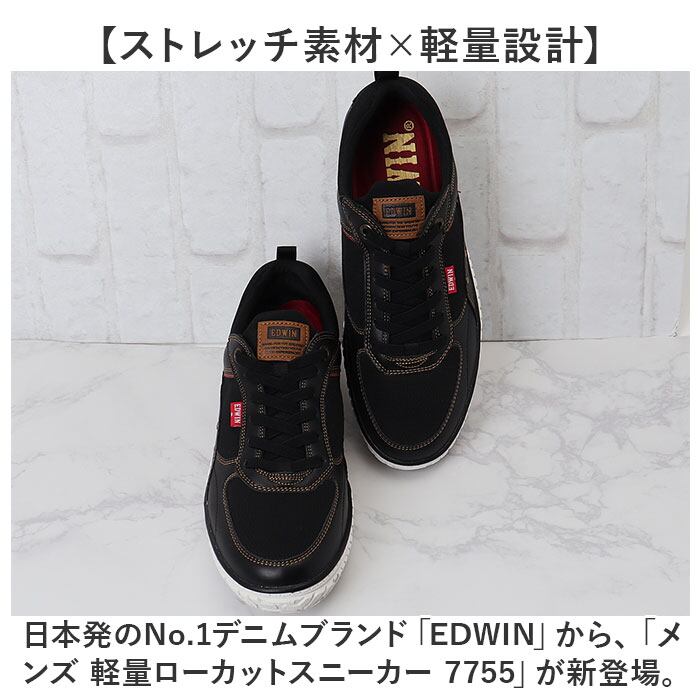 「ストレッチ素材×軽量設計」で、着用時のストレスフリー。日本発のNo.1デニムブランド「EDWIN」から、「メンズ 軽量ローカットスニーカー 7755」が新登場。