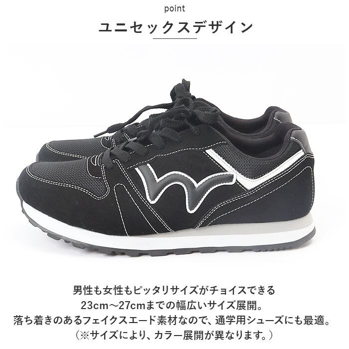 ・男性も女性もピッタリサイズがチョイスできる23cm~27cmまでの幅広いサイズ展開。落ち着きのあるフェイクスエード素材なので、学生さんの通学用シューズにも最適。(※サイズにより、カラー展開が異なります。)