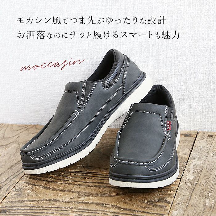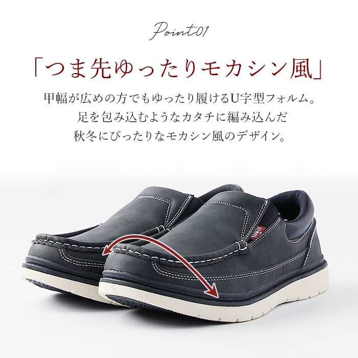 ・履き口両サイドのサイドゴアで、サッと脱ぎ履きができるスリッポンタイプ。つま先がスッと入り、快適なフィット感。