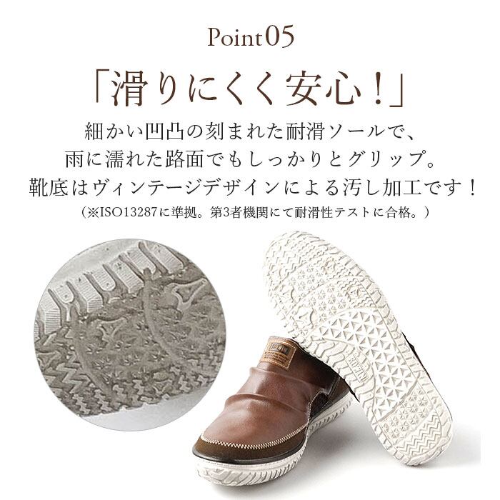 ・細かい凹凸の刻まれた耐滑ソールで、雨に濡れた路面でもしっかりとグリップ。敢えてビンテージ感のある汚し加工を施した仕上がりが注目ポイント。(※ISO13287に準拠。第3者機関にて耐滑性テストに合格。)