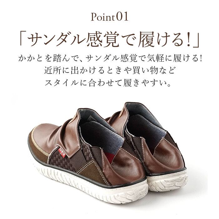 ・甲幅が広めの方でもゆったり履ける「幅広ワイド設計」。足の甲に合わせて伸縮するサイドゴアに、内側にはフィット感を高めるセンターゴアを内蔵し、脱ぎ履きスムーズ。