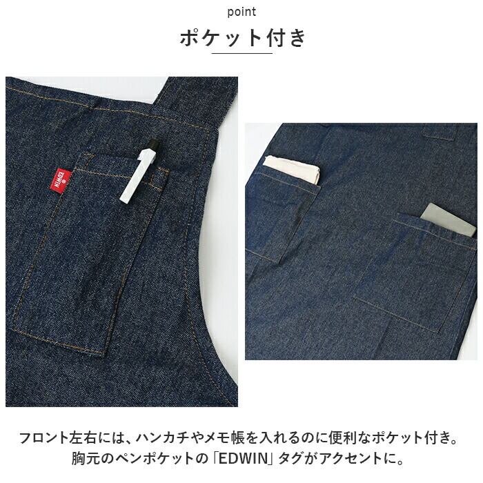 ・フロント左右には、ハンカチやメモ帳を入れるのに便利なポケット付き。胸元のペンポケットの「EDWIN」タグがアクセントに。