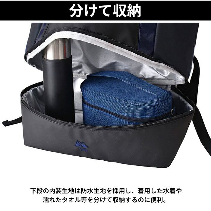 ・上段と下段で使い分けができる2層仕様◎下段の内装生地は防水生地を採用し、着用した水着や、濡れたタオル等を分けて収納するのに便利。