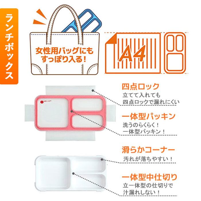 ・パッキンは一体成型、さらに仕切りの4隅は滑らか形状で、洗い物もラクラク!もちろん食器洗浄機・電子レンジの使用もOK!(※電子レンジを使用する時は、フタを外してからご使用ください)