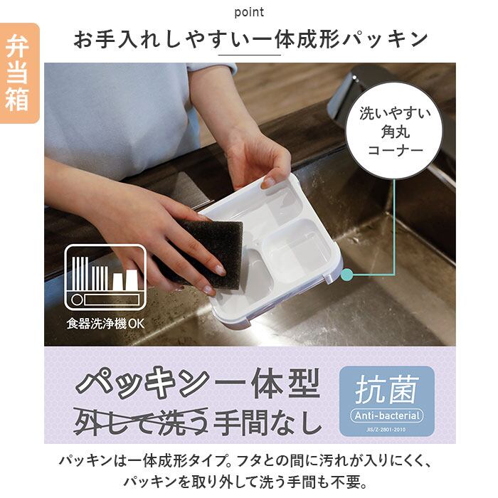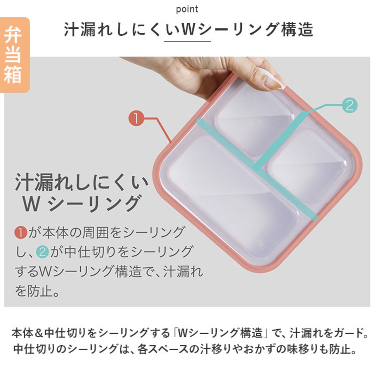 ・本体&中仕切りをシーリングする「Wシーリング構造」で、汁漏れをガード。中仕切りのシーリングは、各スペースの汁移りやおかずの味移りも防止。