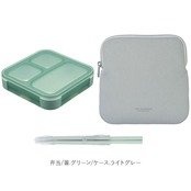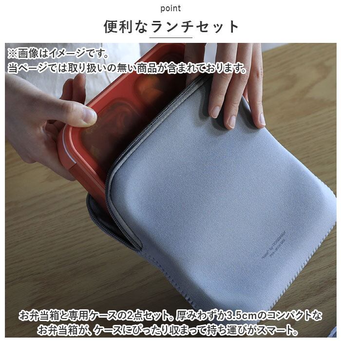 ・お弁当箱・専用ケース・お箸の3点セット。厚みわずか3.5cmのコンパクトなお弁当箱に、ぴったりサイズのケースとお箸。お弁当箱とお箸は食洗機対応。