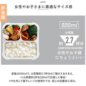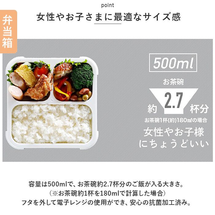 ・容量は500mlで、お茶碗約2.7杯分のご飯が入る大きさ。フタを外して電子レンジの使用ができ、安心の抗菌加工済み。