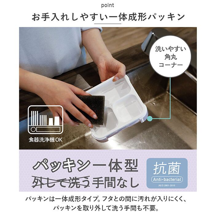 ・本体&中仕切りをシーリングする「Wシーリング構造」で、汁漏れをガード。中仕切りのシーリングは、各スペースの汁移りやおかずの味移りも防止。