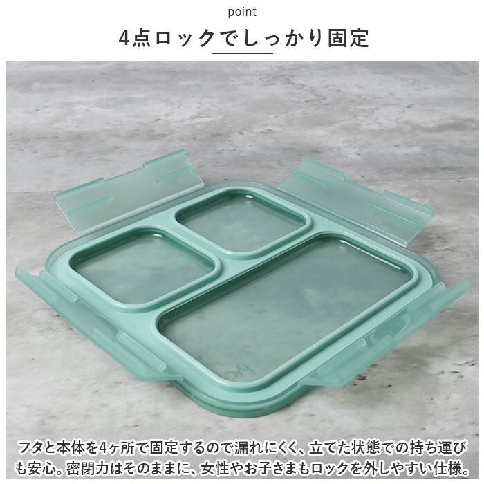 ・フタと本体を4ヶ所で固定するので漏れにくく、立てた状態での持ち運びも安心。密閉力はそのままに、女性やお子さまもロックを外しやすい仕様。