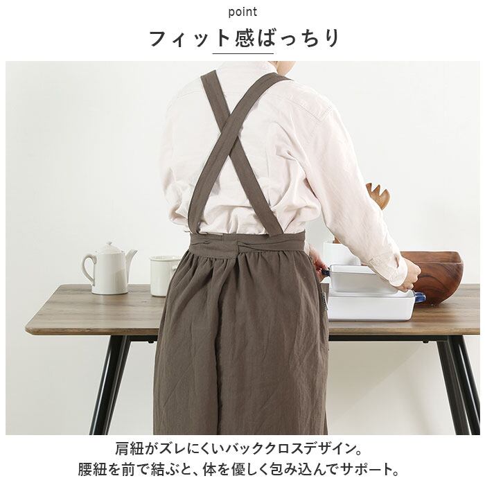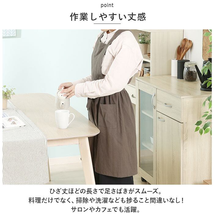 ・ひざ丈ほどの長さで足さばきがスムーズ。料理だけでなく、掃除や洗濯なども捗ること間違いなし!サロンやカフェでも活躍。