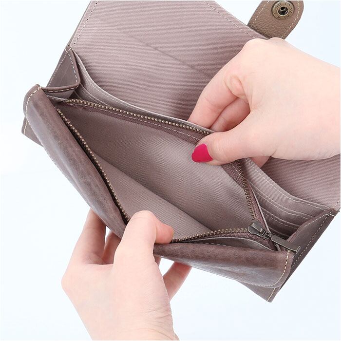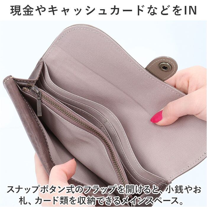 ・スナップボタン式のフラップを開けると、小銭やお札、カード類を収納できるメインスペース。