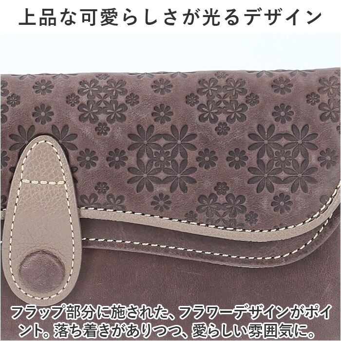 ・フラップ部分に施された、フラワーデザインがポイント。落ち着きがありつつ、愛らしい雰囲気に。