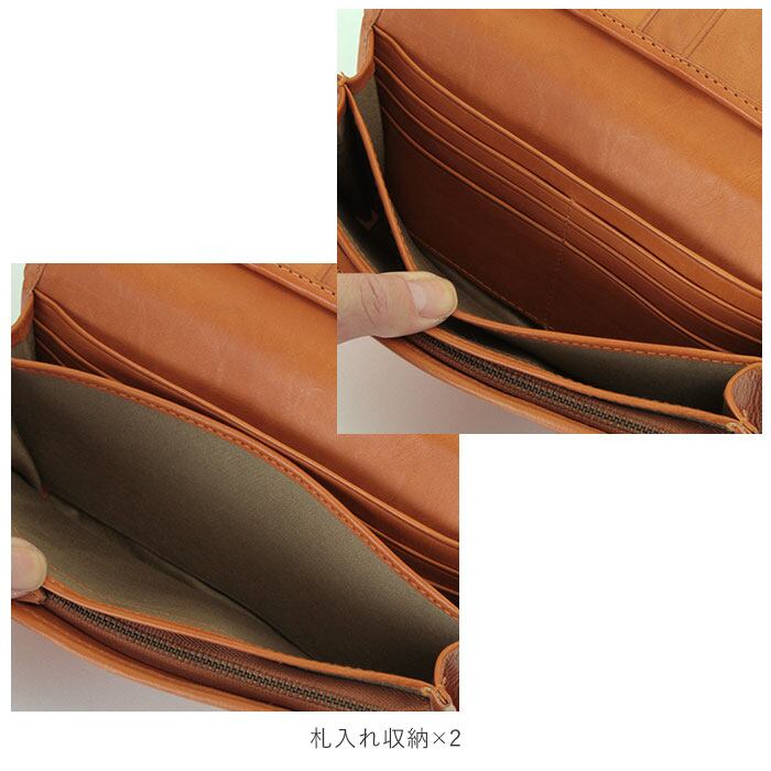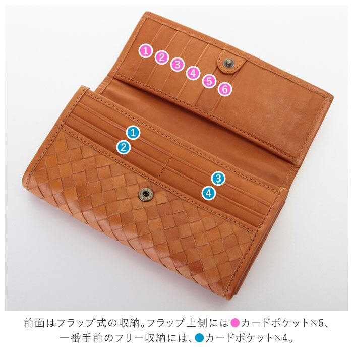 ・前面はフラップ式の収納で、背面にはオープンポケット×1という作り。スナップボタン式のフラップを開いて下側には、札入れ収納×2、フリー収納×2、小銭入れ×1。一番手前のフリー収納には、カードポケット×4。奥の札入れにはカードポケット×6。フラップ上側にはカードポケット×6、裏側はフリー収納になっていて大容量。小銭入れはジッパー式で内側に仕切りがあるので、整理しながら収納できる。