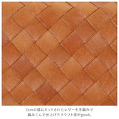 ・1cmの幅にカットされたレザーを手編みで編みこんで仕上げたクラフト感がgood。編み込んだ革のフチにステッチを施しており、おしゃれで頑丈な作り。