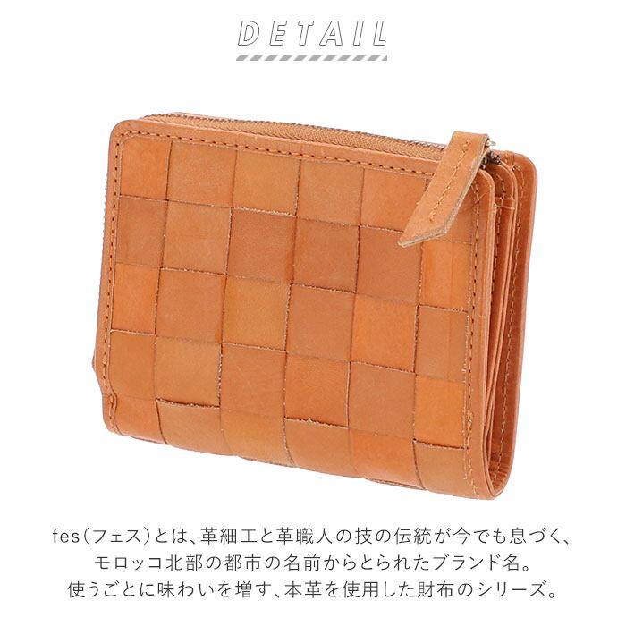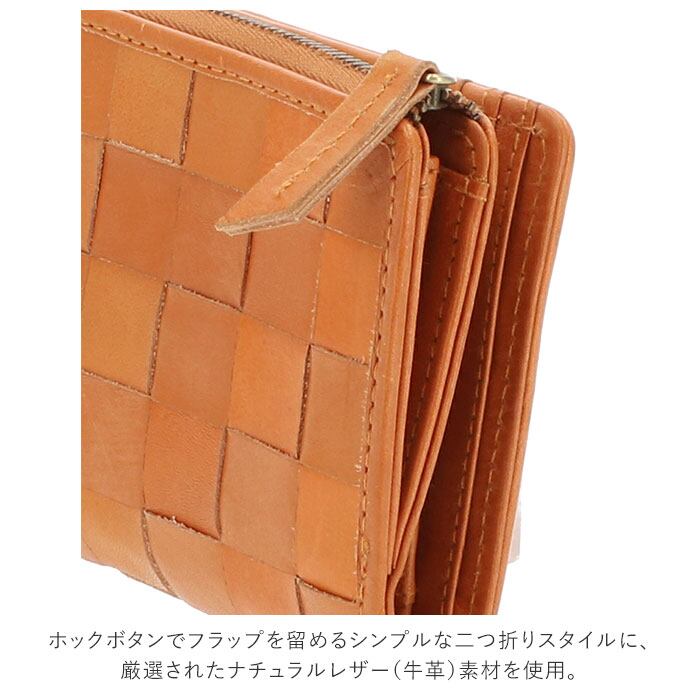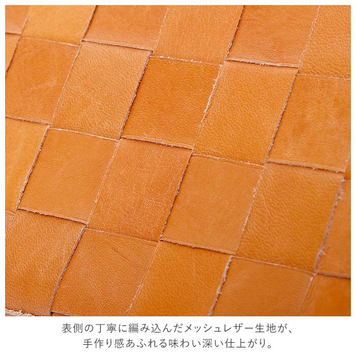 ・ホックボタンでフラップを留めるシンプルな二つ折りスタイルに、厳選されたナチュラルレザー(牛革)素材を使用。表側の丁寧に編み込んだメッシュレザー生地が、手作り感あふれる味わい深い仕上がり。