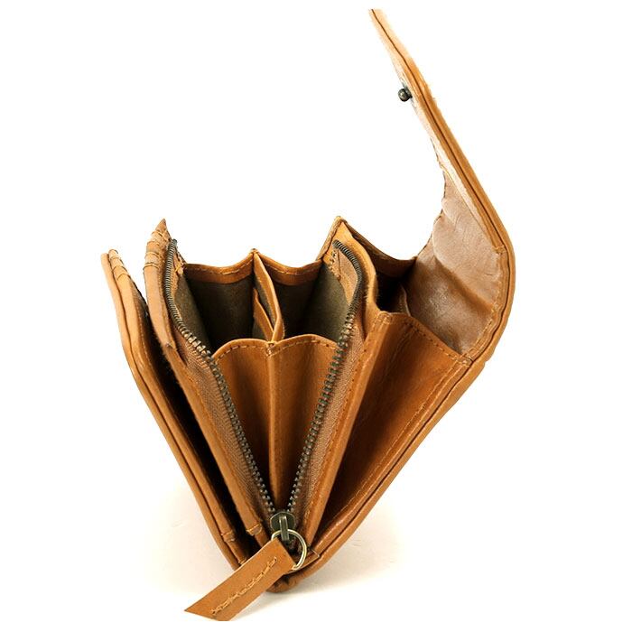 ・スナップボタン式のフラップを開くと、中央にはL字型ファスナー式の小銭入れを配置。内側は2スペースに分かれている上に、仕切りの前面にはフリーポケット×1も装備。