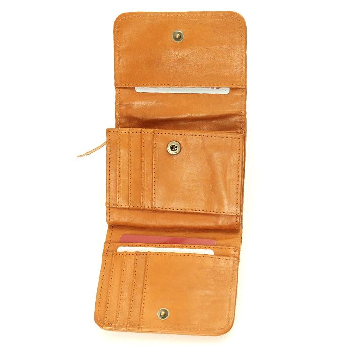 ・経年劣化を楽しめるヌメ革を使用しハンドメイドで仕上げた、クラフト感と暖かみのある雰囲気の三つ折り財布。