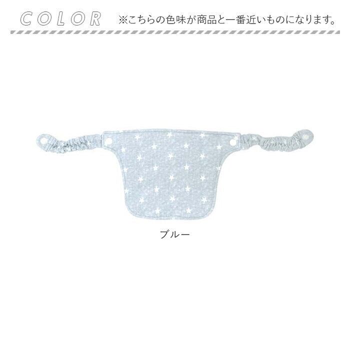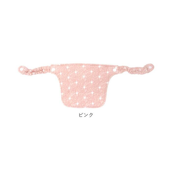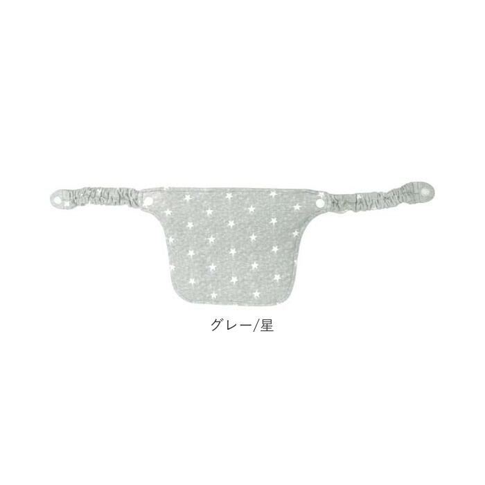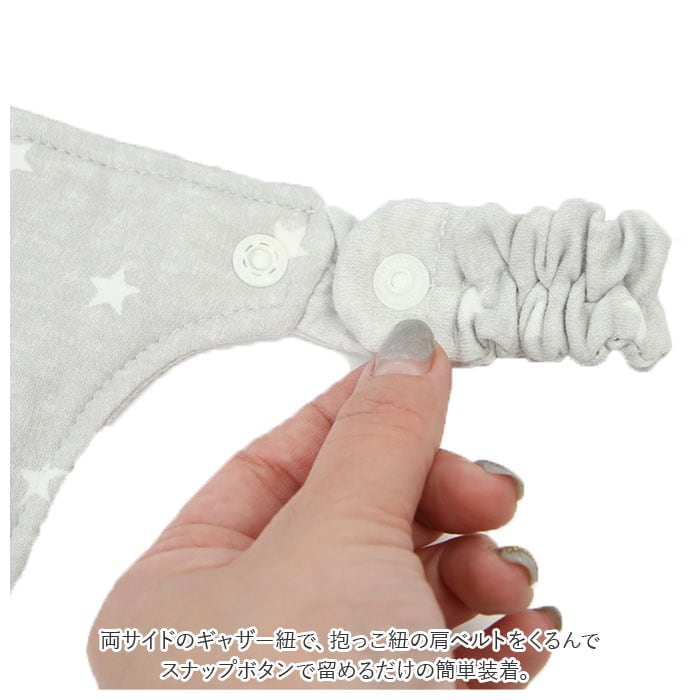 ・両サイドのギャザー紐で、抱っこ紐の肩ベルトをくるんでスナップボタンで留めるだけの簡単装着。