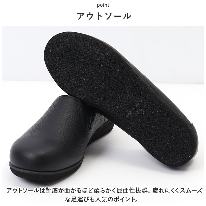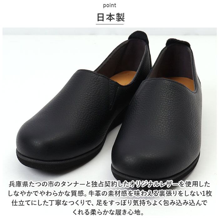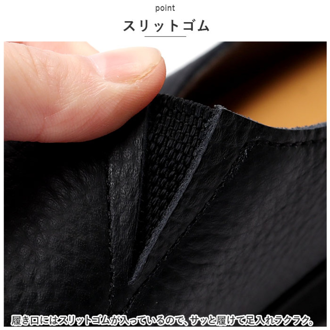 ・兵庫県たつの市のタンナーと独占契約したオリジナルレザーを使用したしなやかでやわらかな質感。牛革の素材感を味わえる裏張りをしない1枚仕立てにした丁寧なつくりで、足をすっぽり気持ちよく包み込み込んでくれる柔らかな履き心地。