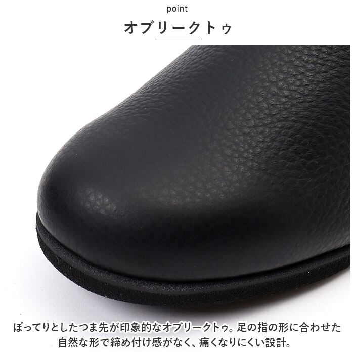 ・ぽってりとしたつま先が印象的なオブリークトゥ。足の指の形に合わせた自然な形で締め付け感がなく、痛くなりにくい設計。