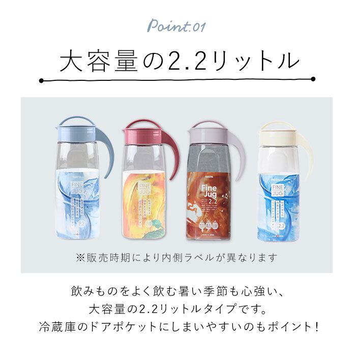 ・一般的な冷蔵庫のドアポケットに収まるタイプの冷水筒、ファインジャグの2本セット。大容量2.2リットルタイプ。