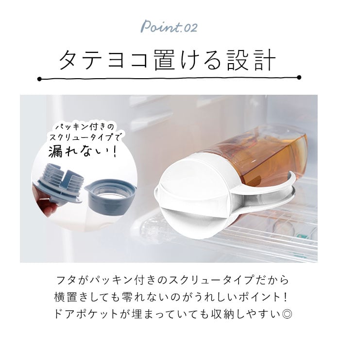 ・蓋はパッキン付きのスクリュータイプ。こぼれないので横置きもOK!冷蔵庫のドアポケットが埋まっていても、いろいろな場所に収納できる♪