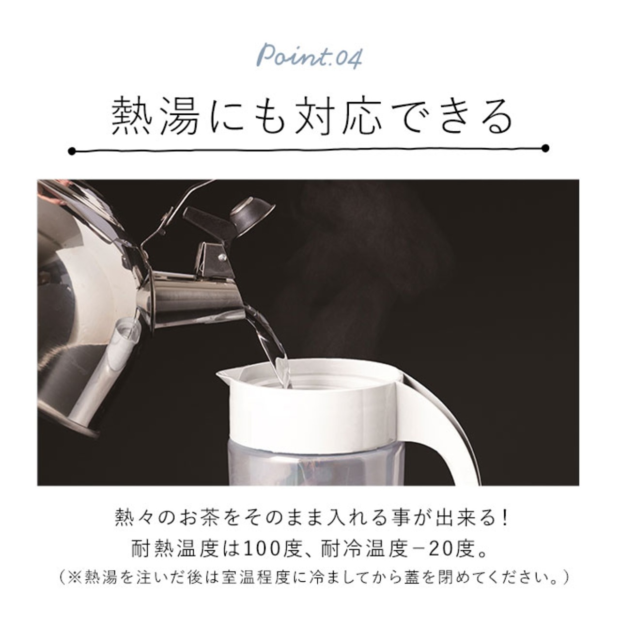 ・熱湯にも対応!熱々のお茶をそのまま入れることができて便利。(※熱湯を注いだ後は室温程度に冷ましてから蓋を閉めてください。)