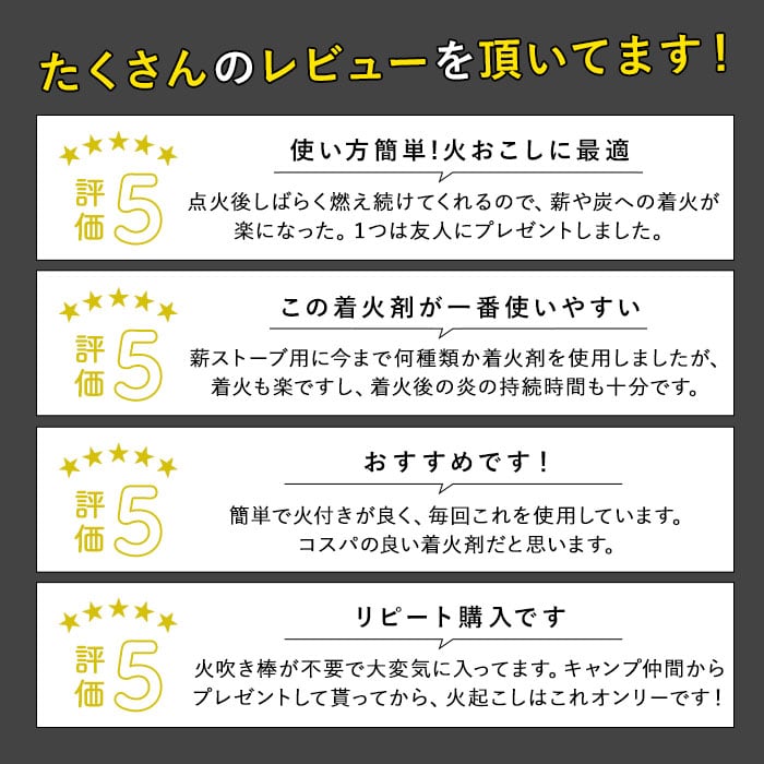 ・燃焼時間が8分間と長く、着火剤としてBBQ、キャンプファイヤー、薪ストーブ、暖炉にも最適。