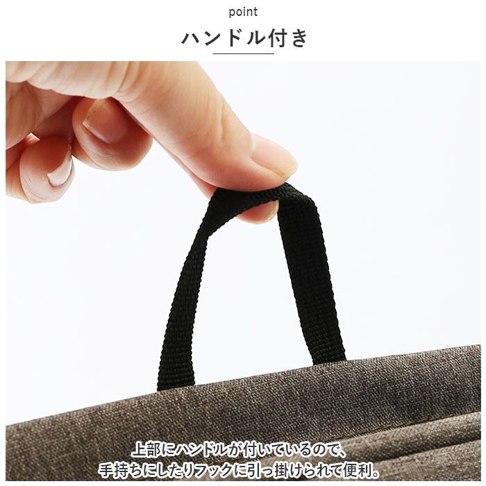 ・上部にハンドルが付いているので、手持ちにしたりフックに引っ掛けられて便利。