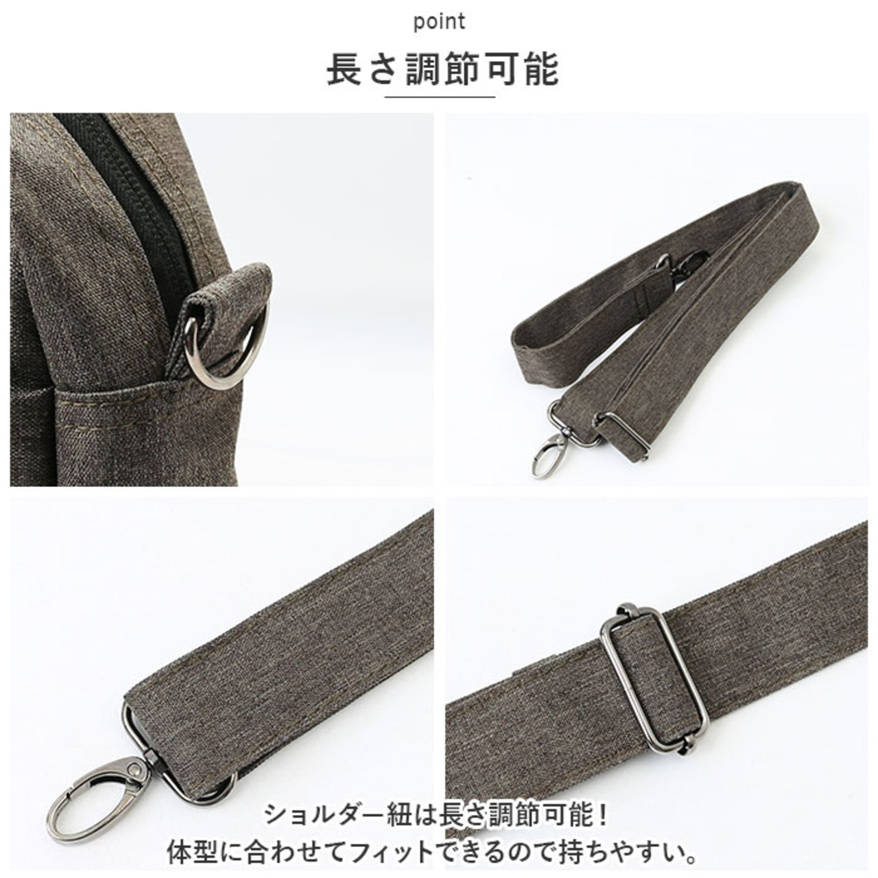 ・ショルダー紐は長さ調節可能!体型に合わせてフィットできるので持ちやすい。