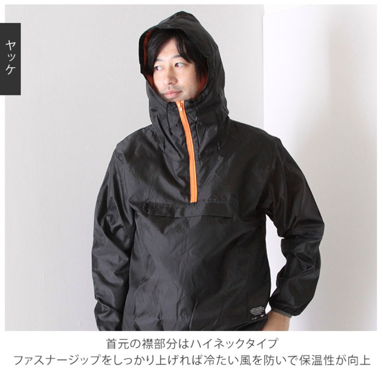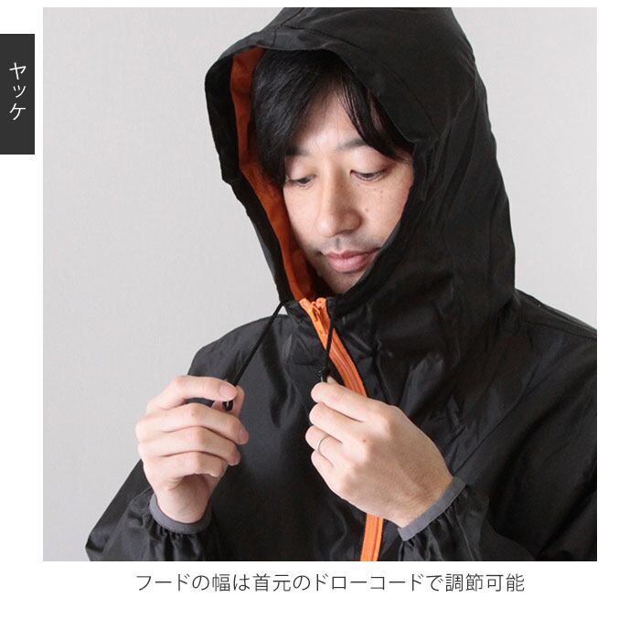 ・首元の襟部分はハイネックタイプ。ファスナージップをしっかり上げれば冷たい風を防いで保温性が向上。フードの幅は首元のドローコードで調節可能。