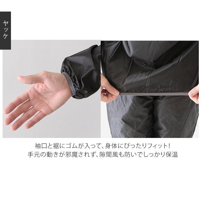 ・袖口と裾にゴムが入って、身体にぴったりフィット!手元の動きが邪魔されず、隙間風も防いでしっかり保温。