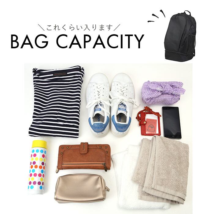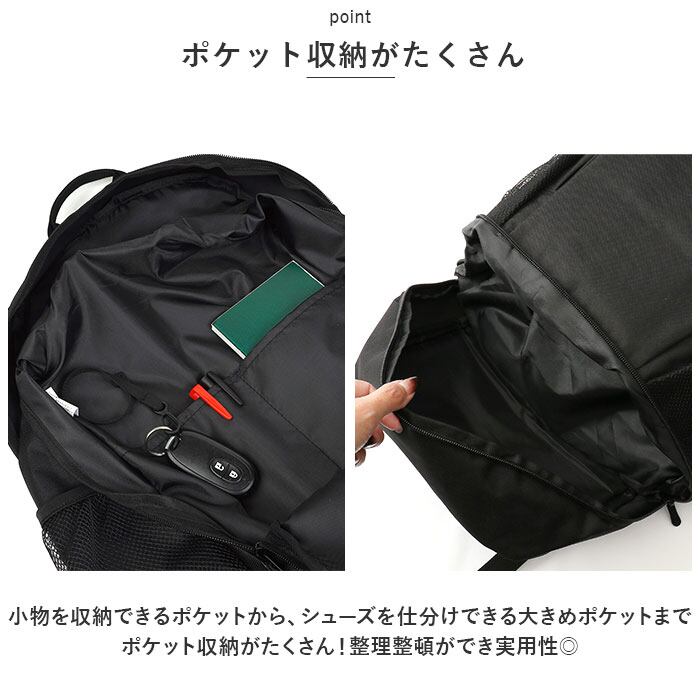 ・底面にシューズポケット付き。メイン収納と別れているので汚れを気にせず収納可能。部活動やジムのスポーツシーンに最適。