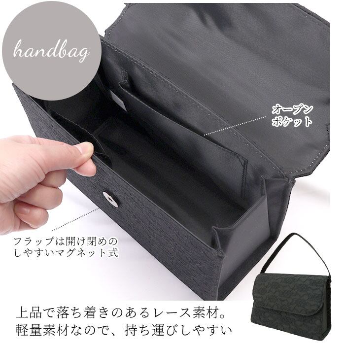 ・上品で落ち着きのあるレース素材。軽量素材なので、持ち運びしやすい。