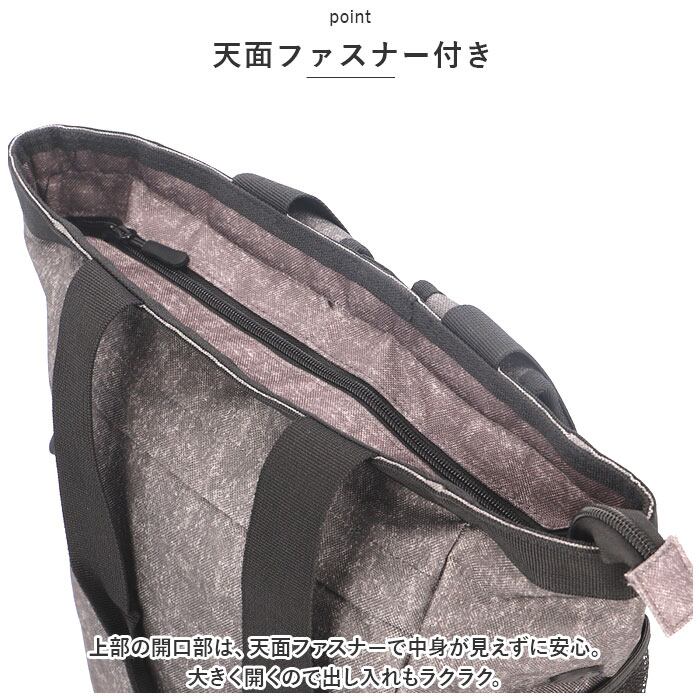 ・上部の開口部は、天面ファスナーで中身が見えずに安心。大きく開くので出し入れもラクラク。