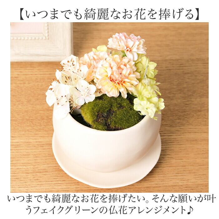・いつまでも綺麗なお花を捧げたい。そんな願いが叶うフェイクグリーンの仏花アレンジメント♪