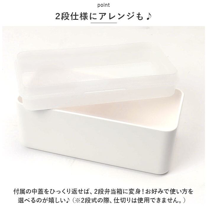 ・付属の中蓋をひっくり返せば、2段弁当箱に変身!お好みで使い方を選べるのが嬉しい♪(※2段式の際、仕切りは使用できません。)