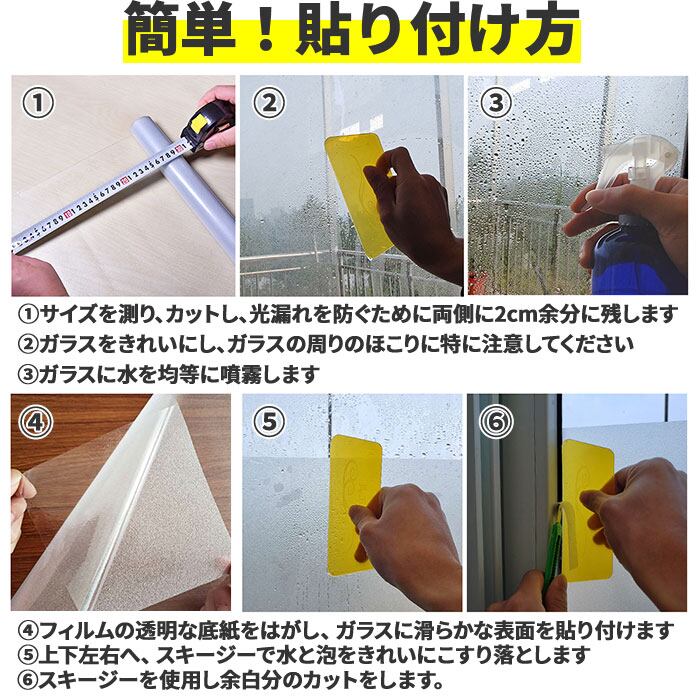 ・窓ガラス表面とガラスフィルム表面を霧吹きで軽く濡らして、ピタッと窓ガラス貼り付けるだけ!